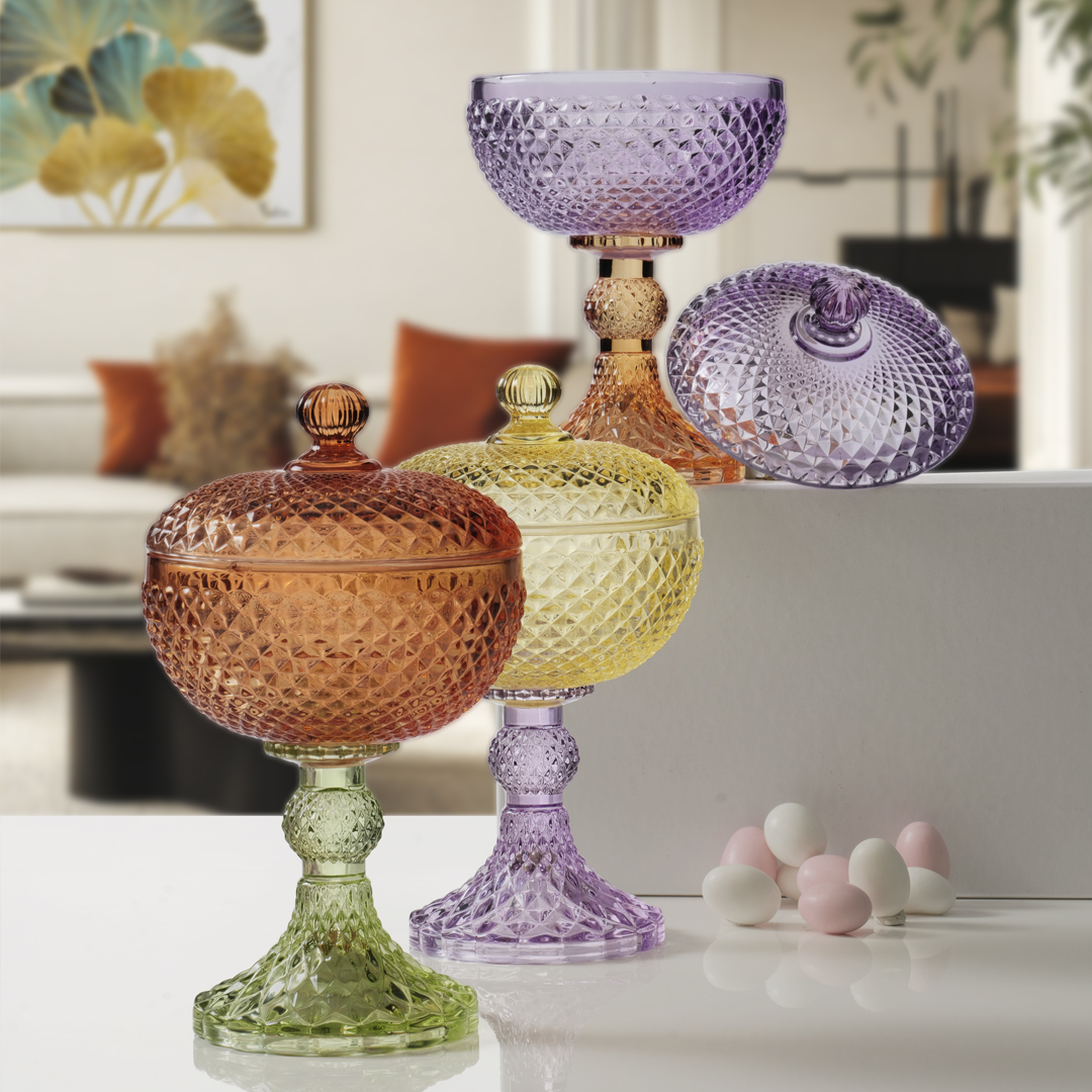 SCATOLA VETRO GIALLO CON PIEDE VIOLA CM. Ø10,5XH18,5