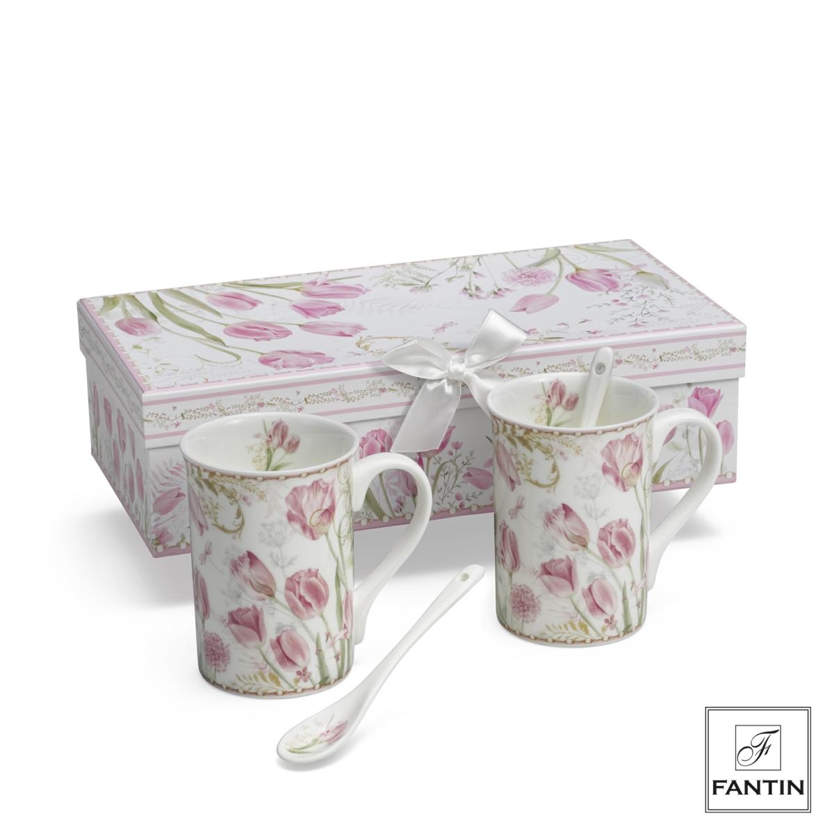 SET 2 TAZZE E 2 CUCCHIAI TULIPANI IN PORCELLANA CM. Ø7,5XH10,5